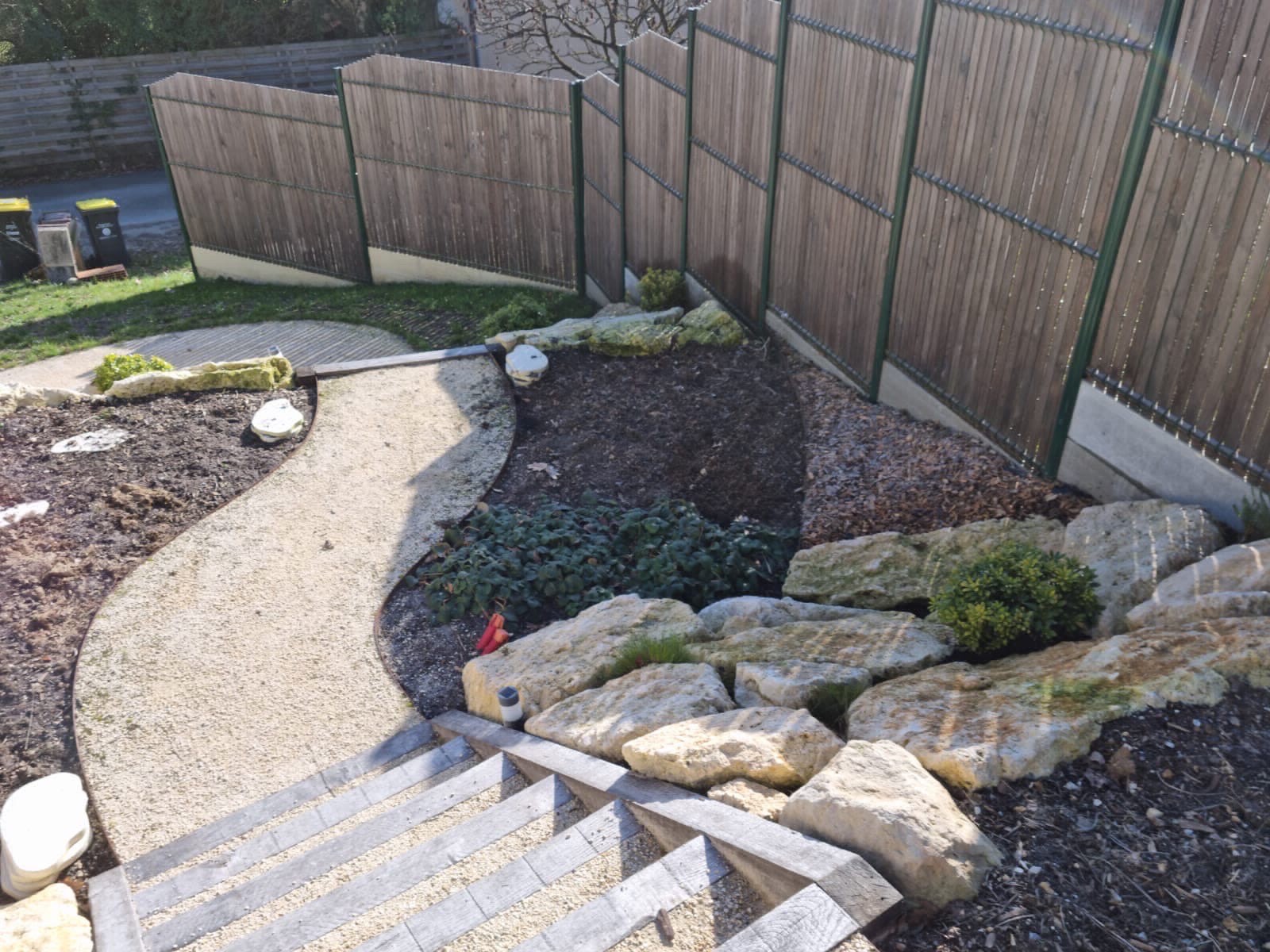 Pour délimiter harmonieusement les espaces, nous avons installé des bordures métalliques. Elles permettent d’encadrer les allées et massifs tout en apportant une finition soignée. Une clôture rigide a également été posée pour garantir une meilleure protection et préserver l’intimité du jardin.