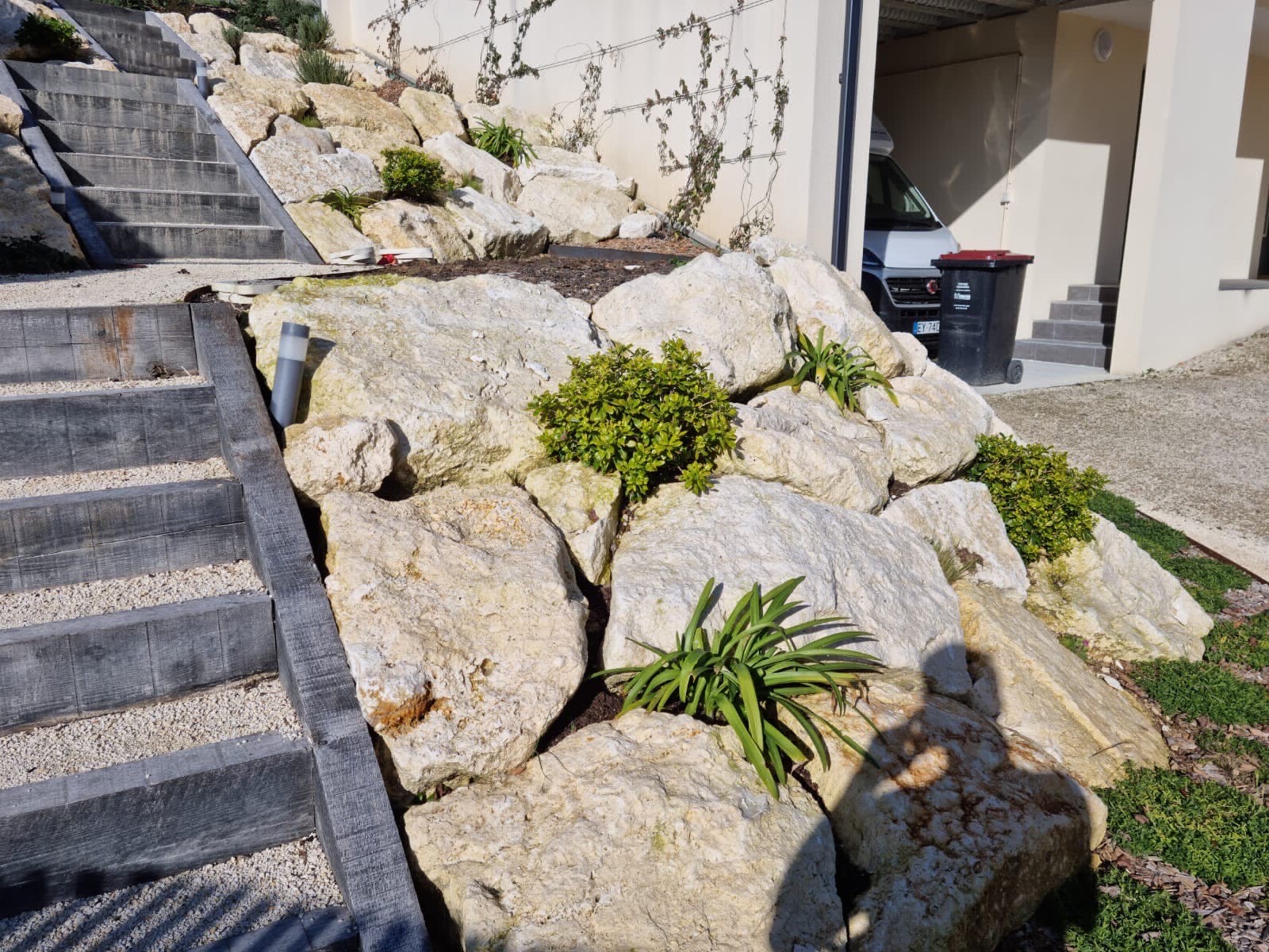 Afin d’adapter le terrain et faciliter la circulation, nous avons réalisé un enroulement du sol pour créer un jardin en terrasses. Ce travail permet de stabiliser les niveaux et de prévenir l’érosion tout en valorisant chaque espace. Nous avons également conçu une allée en calcaire, idéale pour offrir un cheminement esthétique et drainant, facilitant l’accès au jardin en toutes saisons.