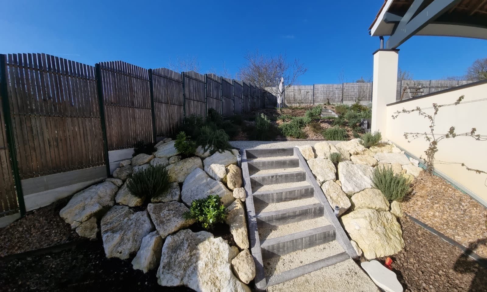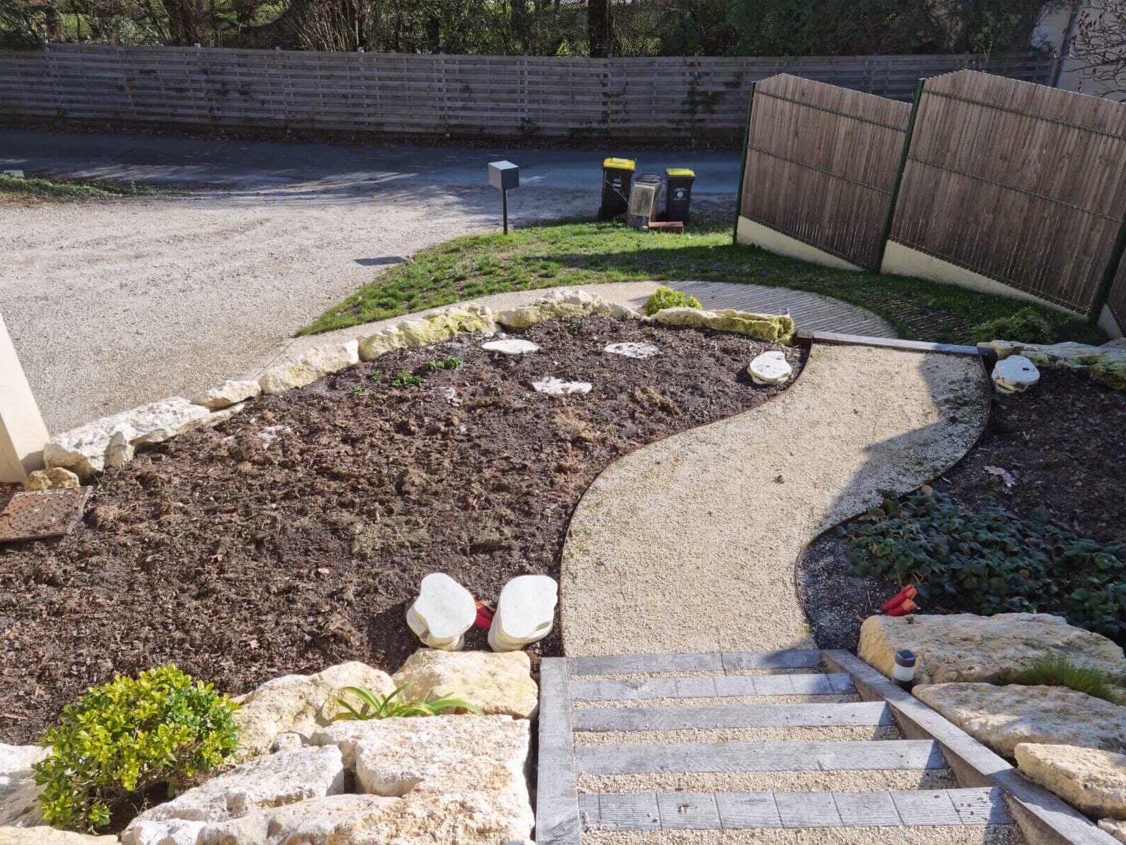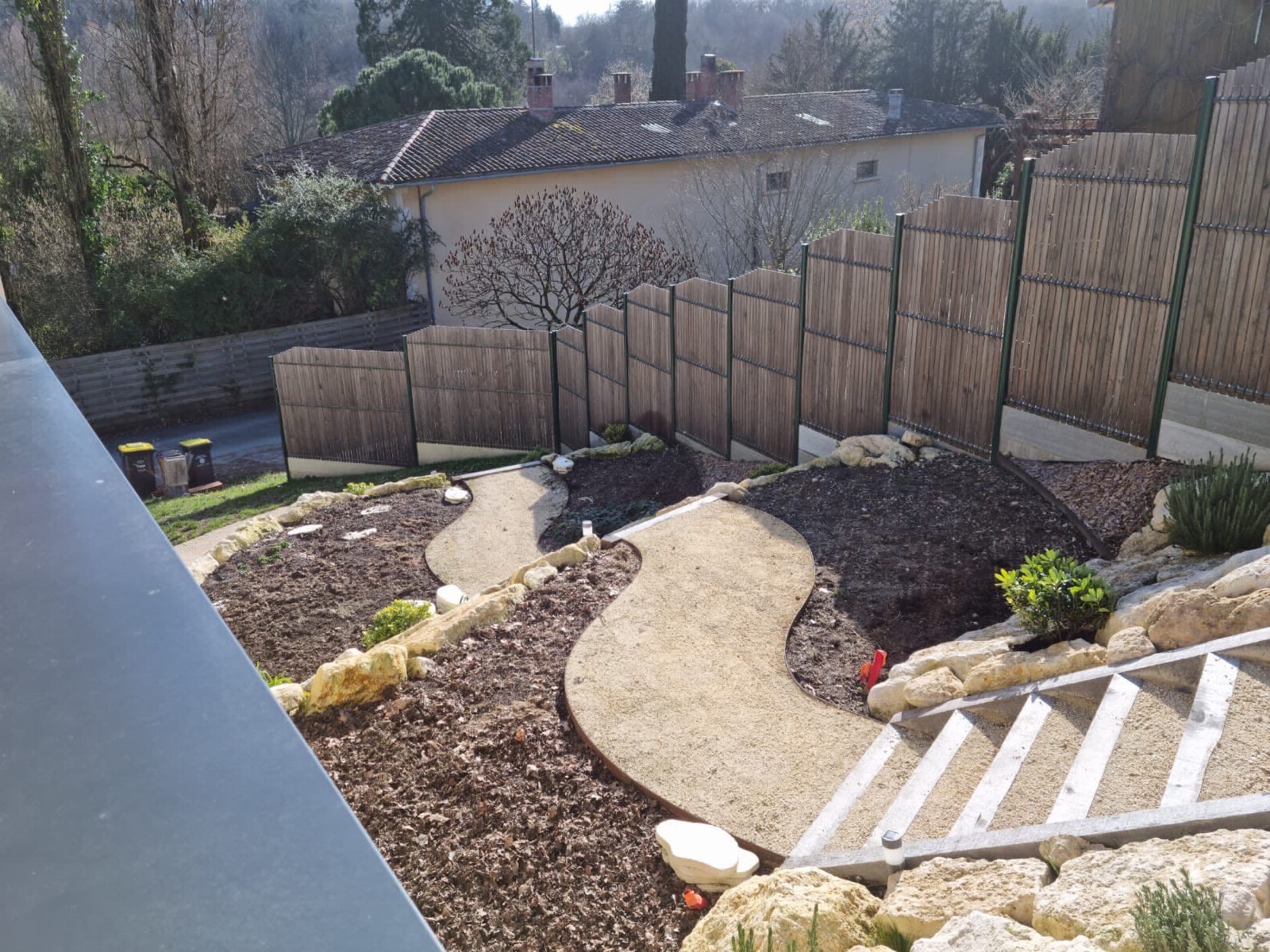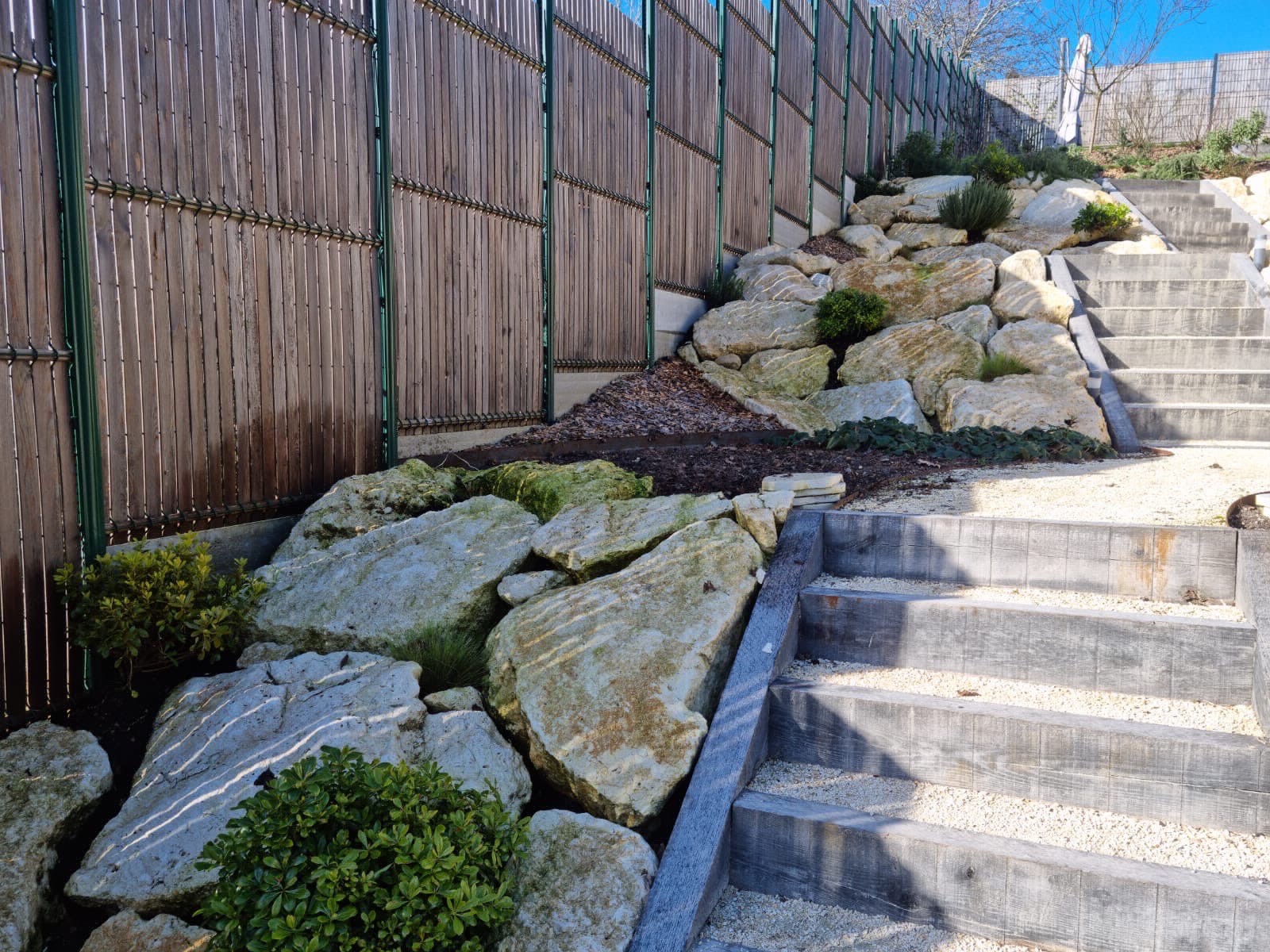Ce projet de création d'escaliers extérieurs en traverses à Latresne avec clôture et engazonnement illustre notre expertise en aménagement paysager, alliant fonctionnalité et esthétisme pour un extérieur aussi pratique qu’agréable.